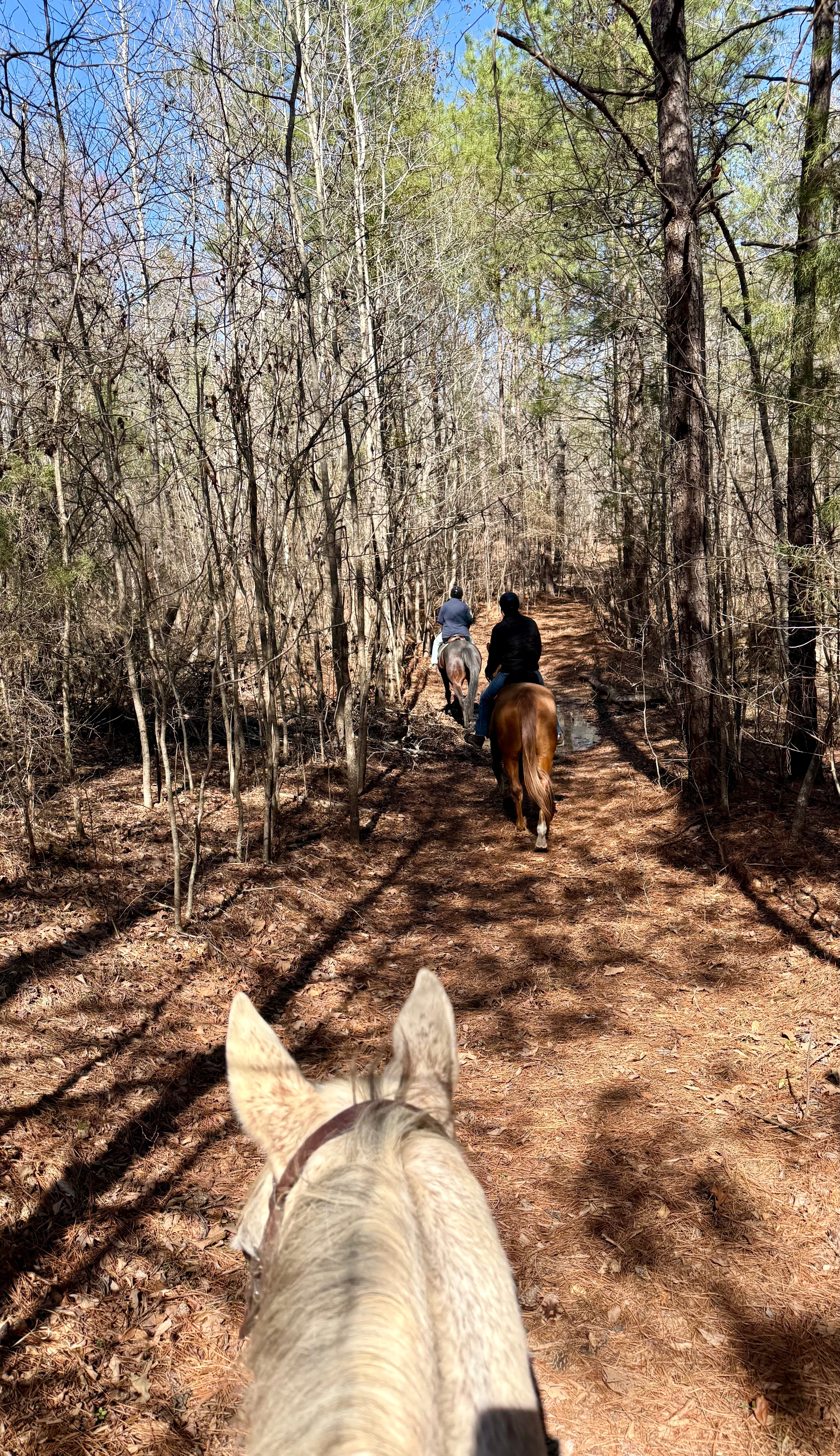 My sister, my best friend, and I rode together for the first time, three women, three horses, three stories braided together on a narrow, tree‑lined path. My Thoroughbred carried me with his familiar rhythm. My sister’s Standardbred moved with the steady, gait she loves. My friend’s Arabian danced beneath her with that bright, alert energy only an Arabian can give.